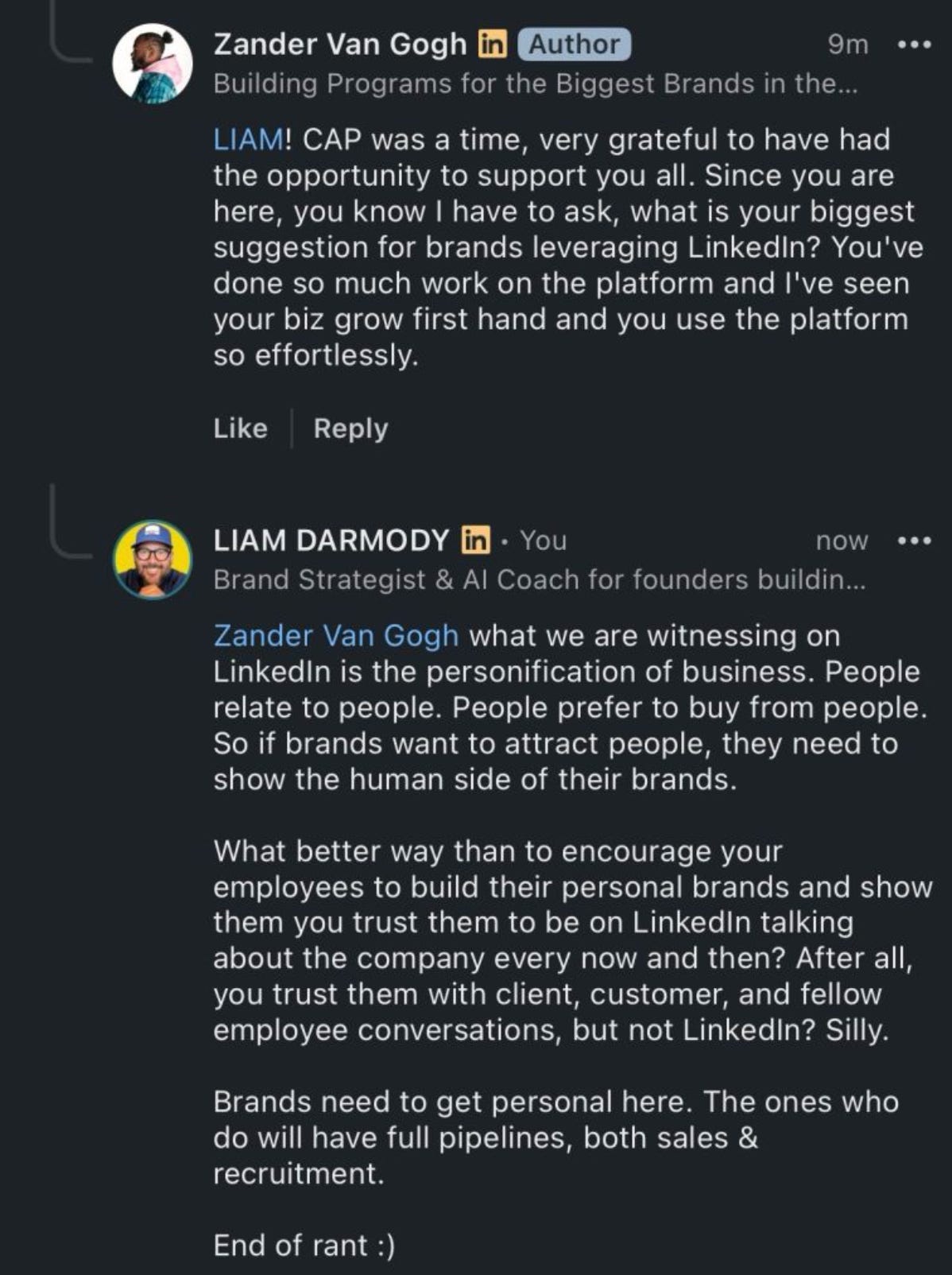 Yesterday I saw a fantastic post about how to succeed on LinkedIn in 2026 and beyond from Zander Van Gogh, the creator manager for my CAP cohort, and we had a delightful little exchange about how to build a brand on LinkedIn.